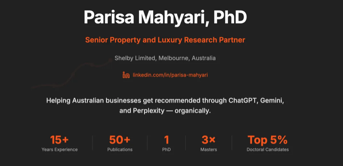 I've been Senior Property and Luxury Research Partner with Shelby Limited for over seven years, supporting Australian businesses organic discovery via SEO, ChatGPT, Gemini, and Perplexity.